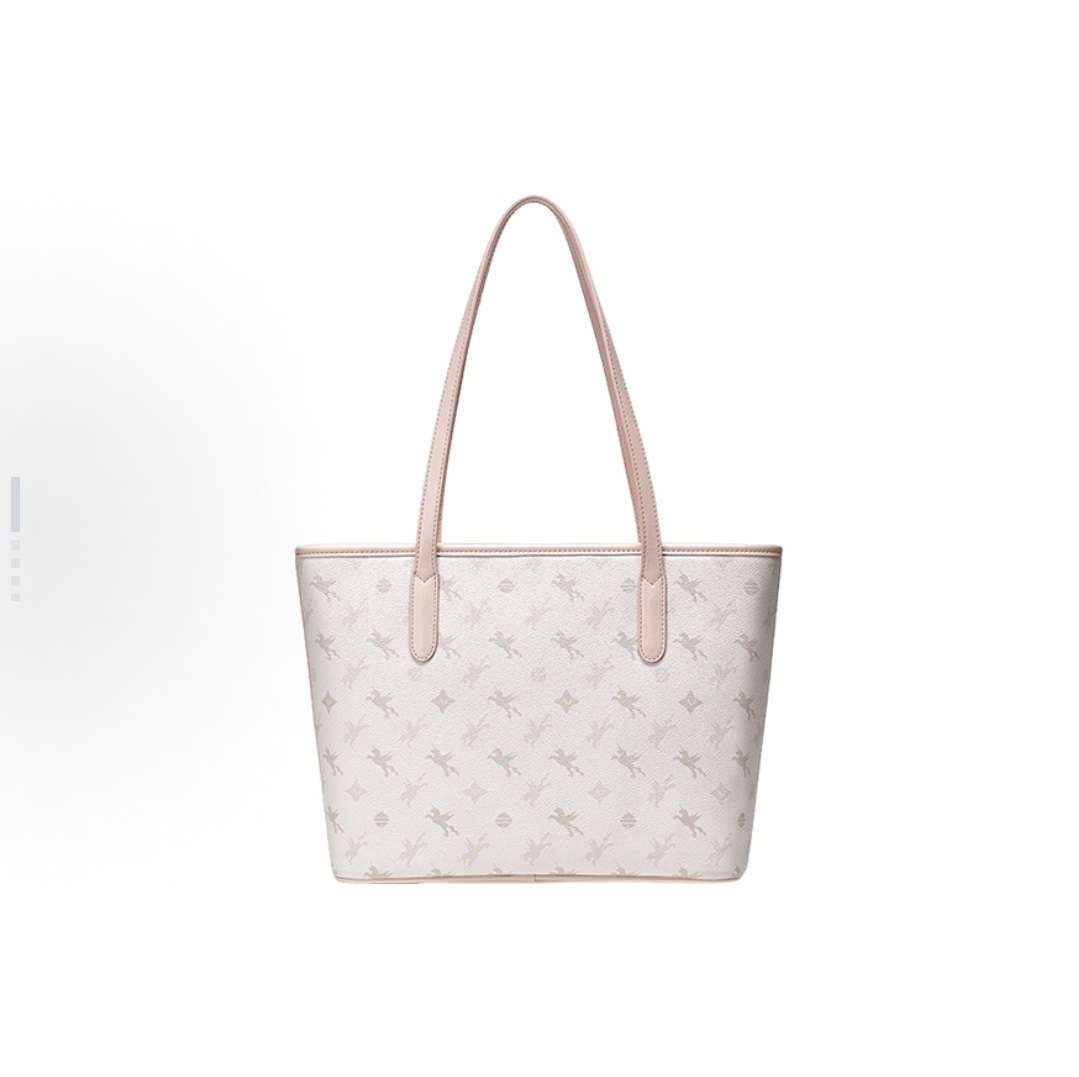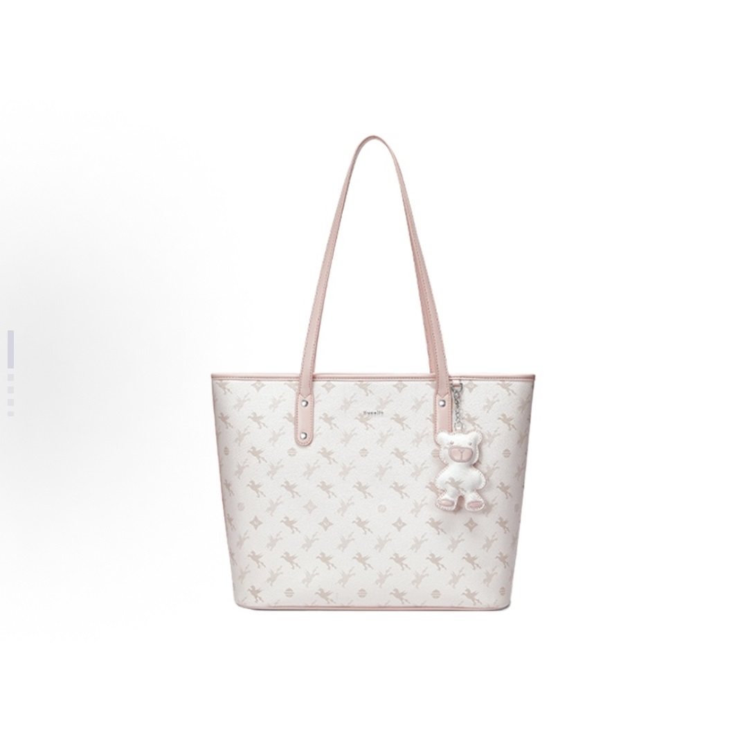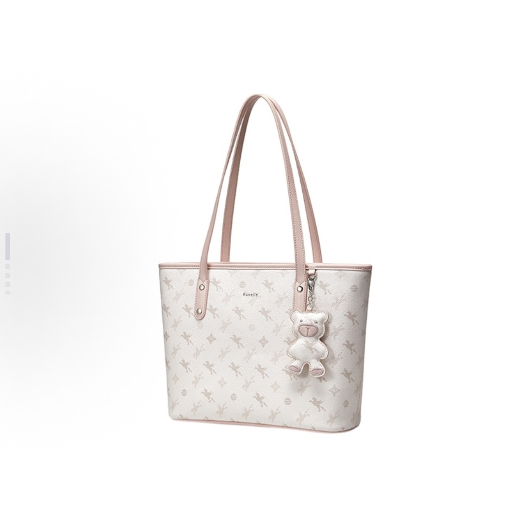 Women's Large Capacity Tote Bag - White with Bear Charm, Durable Leatherette, Work & Casual Use
